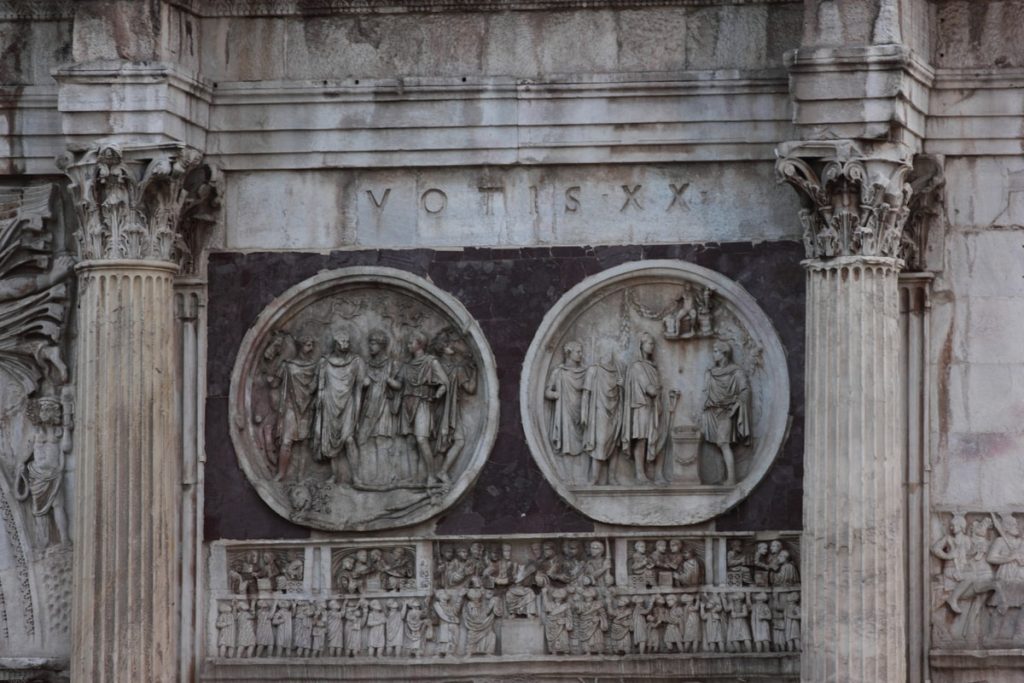 The Emperor Constantine is an important figure in Roman history for multiple reasons: his transformation of Roman politics, the founding of Constantinople (the city we know as Istanbul), and his tolerance and support of the Christian religion. Today, some see the arch as the triumph of Christianity over paganism. Constantine would go on to legalise Christianity in 313 A.D. with the ‘Edict of Milan’ and built three Christian Basilicas in Rome (San Giovanni, St Peters and St Paul’s outside the walls).